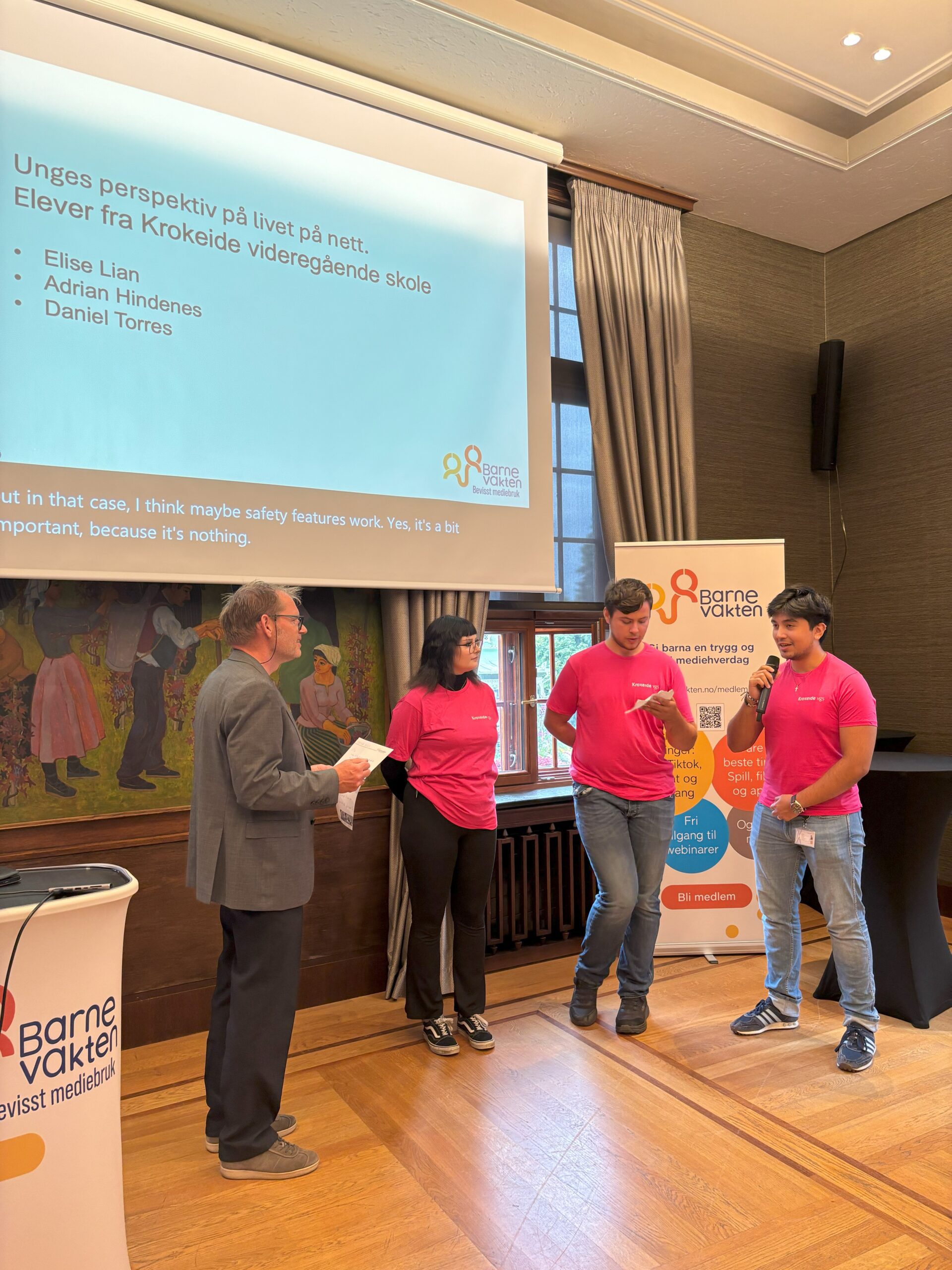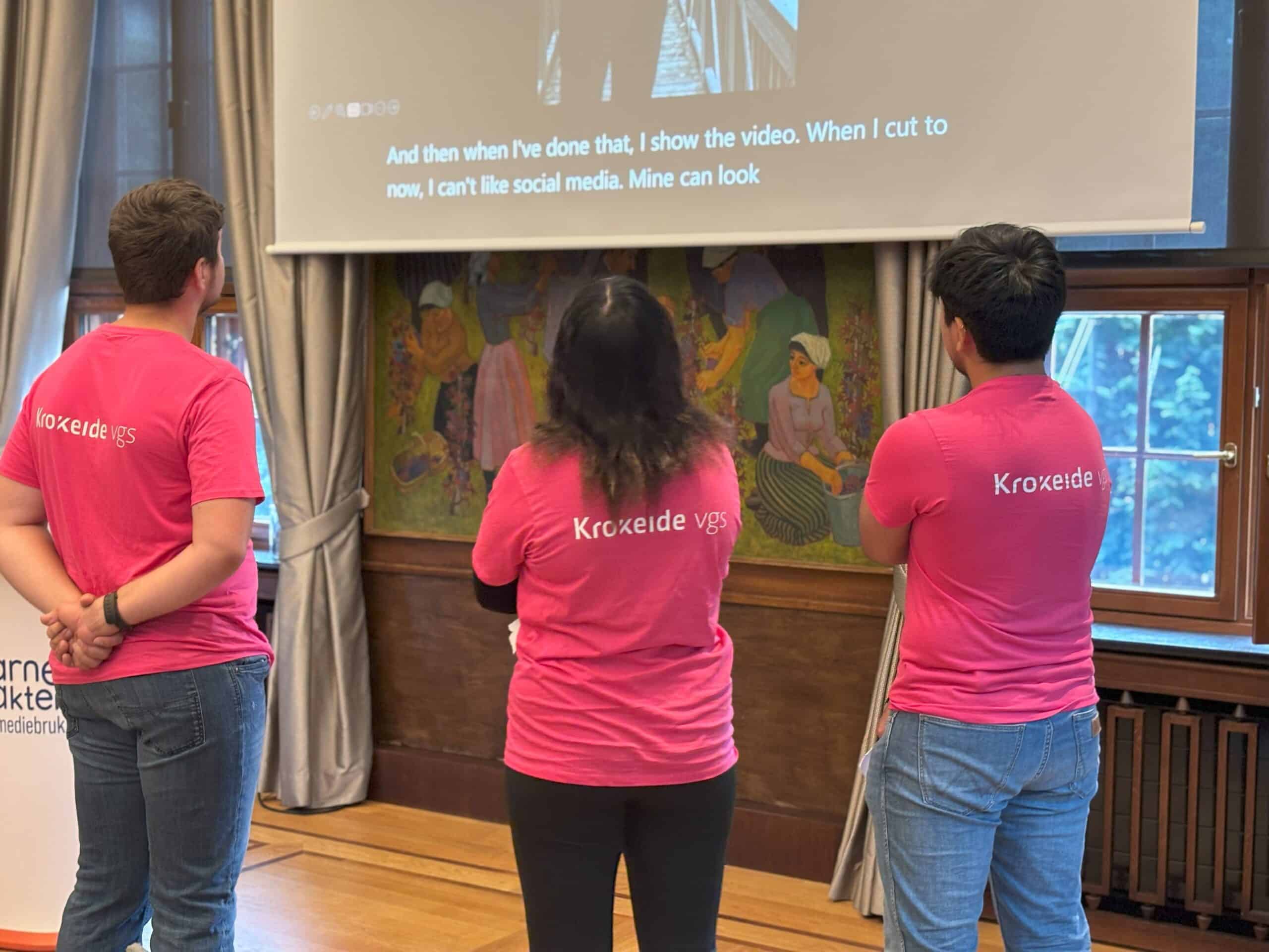Krokeide videregående skole var godt representert med flere ansatte, og viktigst av alt: tre elever som har jobbet med Ung på nett-prosjektet. Elevene Adrian, Daniel og Elise viste frem filmene de har produsert, og ble også intervjuet på podiet av Leif Gunnar, daglig leder i Barnevakten. – Det var gøy å få vise frem arbeidet vårt foran så mange folk, sier Adrian, og fortsetter: – Jeg må jo innrømme at jeg var veldig spent før denne dagen, men det gikk jo kjempebra! – Det var fint og lærerikt å delta på dette, og jeg håper jo at filmene og det jeg har delt av mine erfaringer fra sosiale medier, kan bidra til inn i dette viktige arbeidet, sier Elise. Daniel er enige med sine medelever og tilføyer: – Dette var skikkelig spennende å være med på, og jeg fikk snakket med flere i salen som var imponerte over arbeidet vårt. Jeg har jo lyst til å jobbe med videoproduksjon og IT i fremtiden, så for meg var dette en veldig nyttig erfaring, sier han.